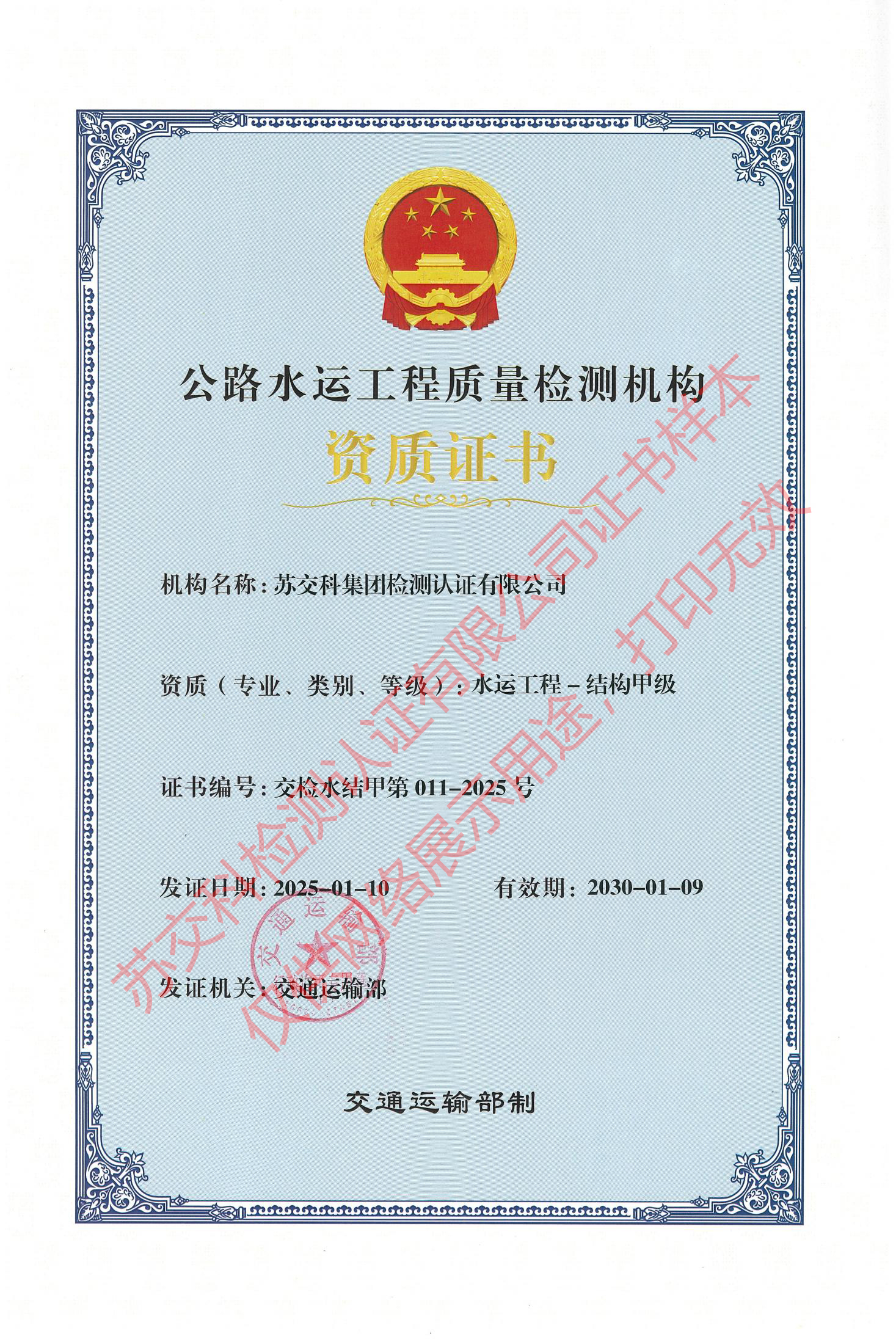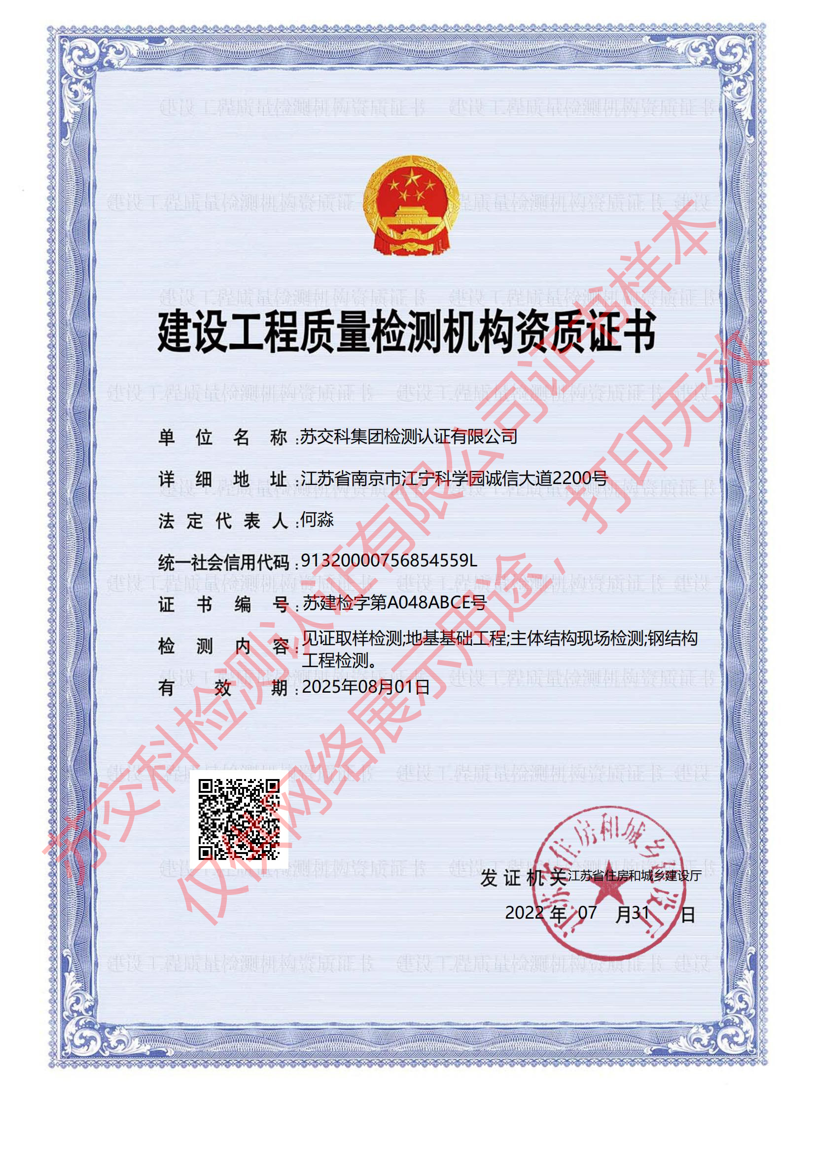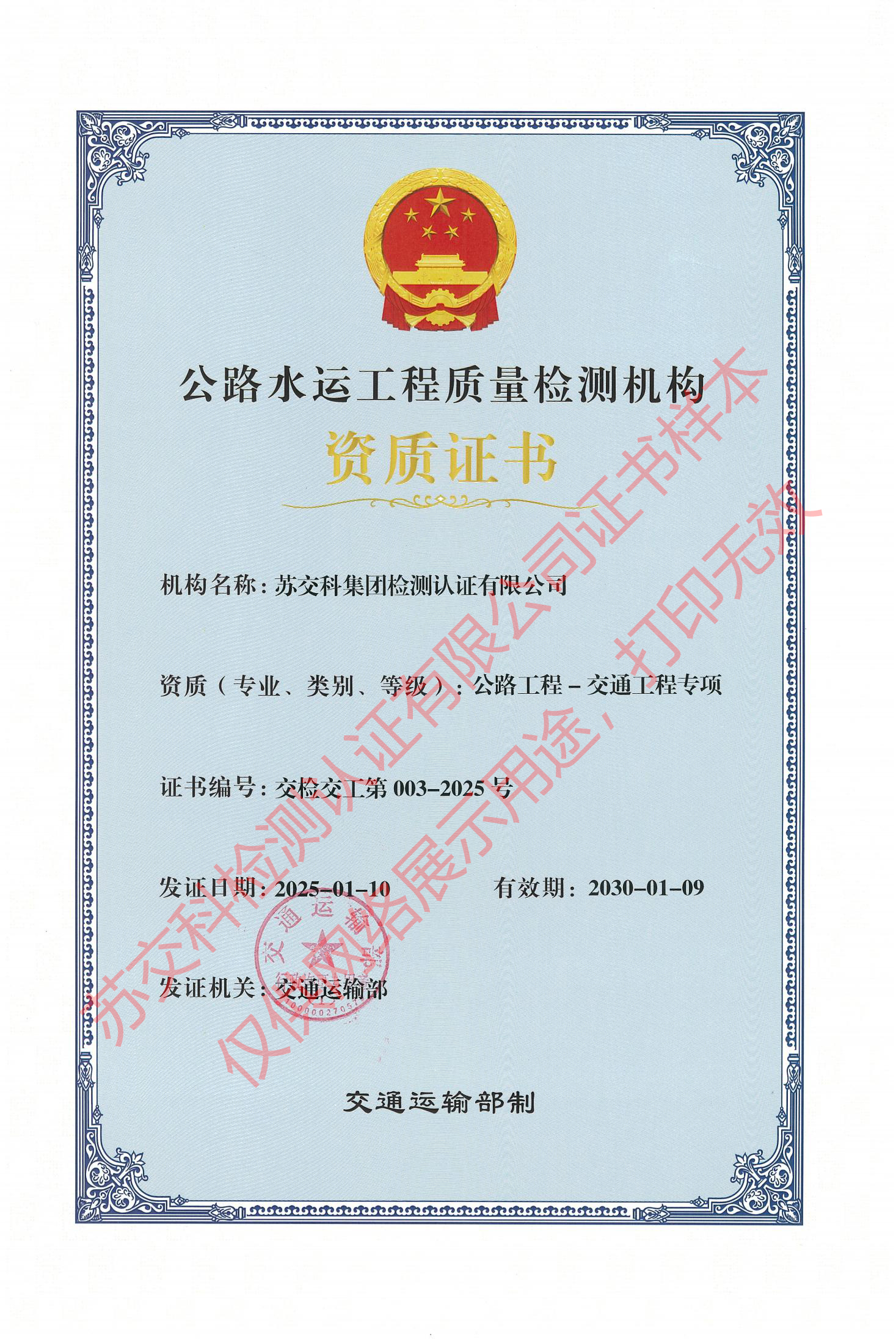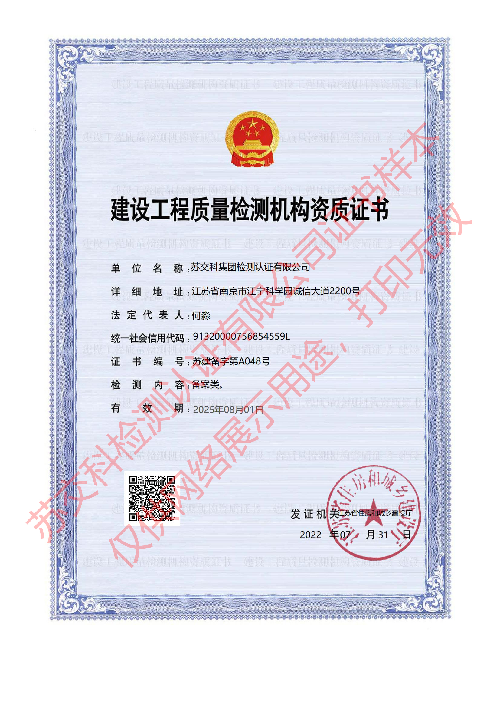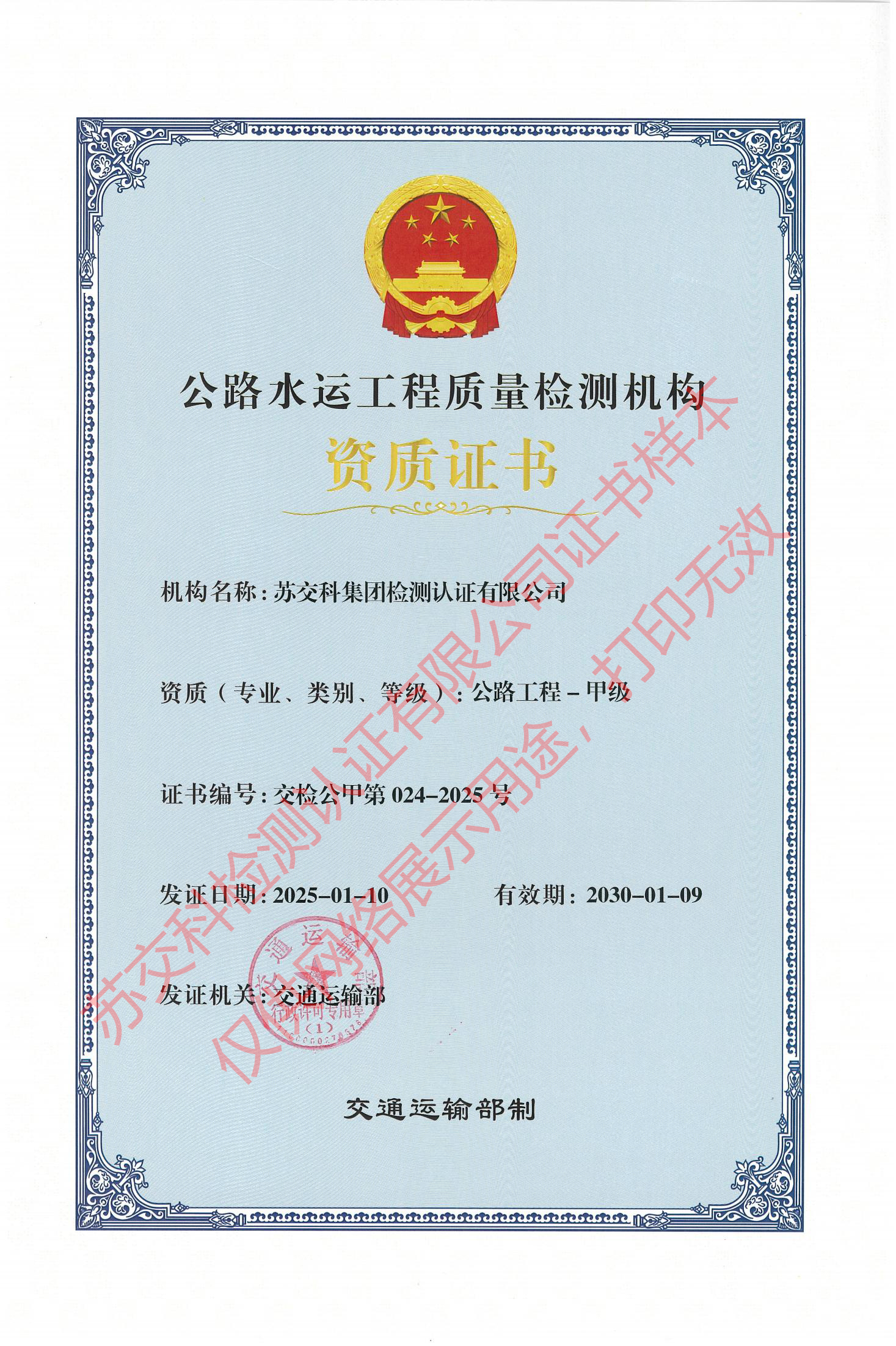 集團資質(zhì)蘇交科擁有工程行業(yè)各領域甲級資質(zhì),包括城鄉(xiāng)規(guī)劃甲級資質(zhì);工程咨詢綜合甲級資質(zhì);工程咨詢專業(yè)甲級資質(zhì)(公路、生態(tài)建設和環(huán)境工程、水文地質(zhì)、工程測量、巖土工程、城市規(guī)劃、鐵路、城市軌道交通、港口河海工程、市政公用工程(市政交通、給排水)、水利工程、旅游工程);工程設計綜合甲級資質(zhì);工程勘察綜合類甲級資質(zhì);測繪甲級資質(zhì);公路工程和市政公用工程總承包一級資質(zhì);公路工程、水運工程、市政公用工程監(jiān)理甲級資質(zhì);公路工程甲級、公路工程交通工程專項、水運工程材料甲級和水運工程結構甲級試驗檢測資質(zhì)。